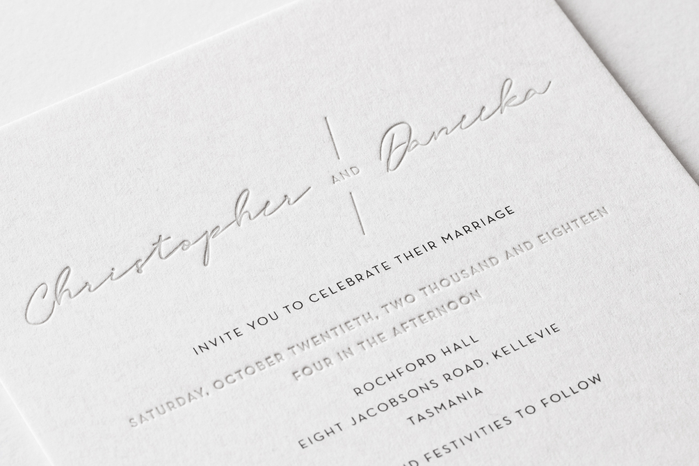 Letterpress wedding invitations suit nearly all design styles, especially those looking for more classic wedding invitations. Elements such as borders, monogrammed initials and wreaths look especially dignified in letterpress as do designs featuring calligraphy style fonts. Letterpress isn’t limited to just typography either, line illustrations can be beautifully depicted with this method. Some like to introduce drawings of greenery or flowers this way, where depicting it as line art doesn’t lock them into a colour theme. Custom letterpress invitations are much more achievable as the plates have to be made to order anyway for each design so they can be easily customised to the couple.